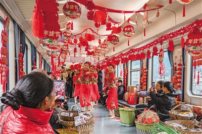 近期,中国铁路成都局集团有限公司联合重庆铁路公安处、贵州省桐梓县文化旅游局等部门,在遵义往返重庆西的5630\5629次列车上举办“年货集市”,旅客在列车上“逛年货”、品尝“年夜饭”、欣赏非遗文化表演,感受浓浓年味。