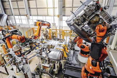 2月7日,在位于吉林长春的一汽解放汽车有限公司卡车厂焊装车间内,流水线上的机器人对零部件进行焊接作业。