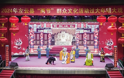 正月里来唱大戏,文化惠民庆新春。为弘扬中华优秀传统文化,营造欢乐、祥和、喜庆的节日氛围,左云县组织县晋剧演艺有限公司,在该县新云新礼堂开展了2024年左云县“两节”群众文化活动过大年唱大戏演出,为群众献上一场高品质的文化盛宴。图为2月19日该县组织演出的晋剧《算粮登殿》。 本报记者 韩堃摄