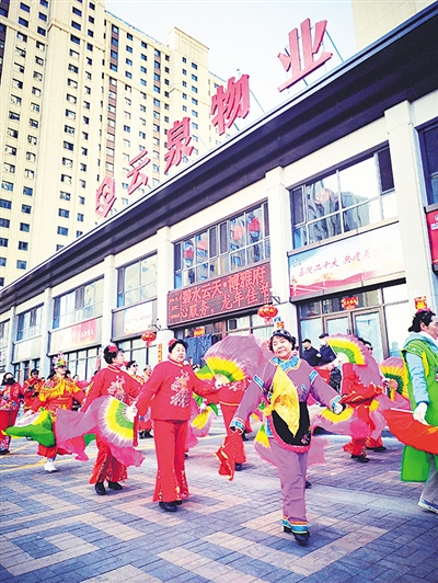 正月初四一大早,记者在碧水云天·博雅府小区看到,鼓乐喧天,热闹非凡。由云泉物业员工与业主自发组织的秧歌队正在表演,队员们踏着欢快的鼓声,甩起亮丽的彩扇,来到碧水云天·博雅府小区,向业主拜年,以此表达他们的幸福喜悦之情。