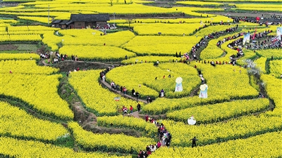 3月16日,游客在贵州省黄平县旧州镇白纸桥村赏花游玩(无人机照片)。春日周末,人们来到户外,赏花游玩,享受春光。 新华社发 王超摄