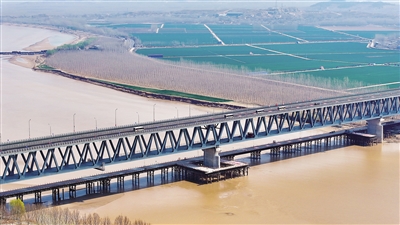 3月26日,车辆行驶在建邦聊(城)泰(安)黄河公铁大桥上(无人机照片)。