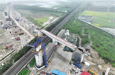 4月2日,沪渝蓉高铁武宜段汉口至汉川东西南下行联络线跨汉丹铁路特大桥转体完成。