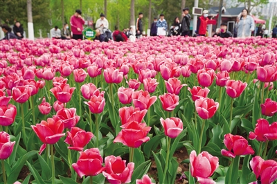 近日,山东省济南市的公园和广场内郁金香陆续盛开,吸引不少市民和游客前来赏花踏春。 新华社记者 徐速绘摄