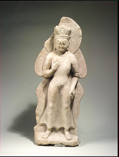 此像通高71厘米,宽29.5厘米,厚5.5厘米。菩萨头戴三珠宝冠,冠上三个圆盘之间用忍冬纹装饰,冠箍两侧垂下三角形冠披。 额上发际由中间分开。造像面相方圆,眉骨微微隆起,眉线清晰,双眼微睁,嘴角上翘,鼻尖和嘴部在出土时已残损。双耳佩戴圆形耳铛,素面无装饰。 直径为22厘米的圆形头光右上部残破。身躯壮硕,双肩直挺,宽胸细腰,颈部饰桃形项圈,左臂上用阴线刻出臂钏。上身斜披络腋,仅刻出轮廓,下身穿羊肠大裙,腰间束带。右手持莲蕾贴置胸前,左手执桃形物垂在体侧。帔帛沿两肩贴身搭下,穿绕双肘后下垂外扬。跣足立于方座上,两脚稍向外撇。