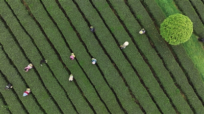 4月5日,村民在贵州省遵义市余庆县松烟镇二龙村茶场采摘春茶(无人机照片)。