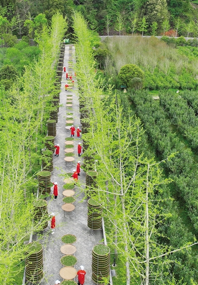 4月10日,工人在位于福鼎市点头镇大坪村的六妙白茶庄园晾晒茶青(无人机照片)。随着气温逐渐攀升,福建福鼎白茶春茶进入采摘和加工高峰期。 新华社记者 林善传摄