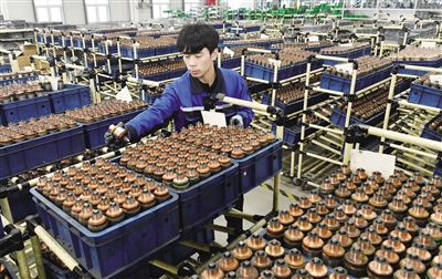 4月11日,河北省河间市一家汽车配件再制造企业的工人在半成品库检查产品质量。
