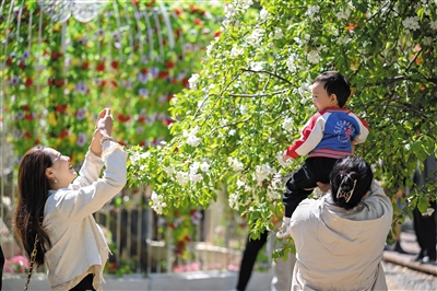 4月20日,游人在呼和浩特市回民区东乌素图村杏林中赏花拍照。