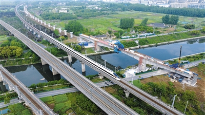 这是新建沪宁合高铁引入合肥枢纽工程跨店埠河特大桥连续梁合龙现场(4月21日摄,无人机照片)。当日,由中铁四局承建的新建上海至南京至合肥高速铁路引入合肥枢纽工程跨店埠河特大桥连续梁顺利合龙,为后续施工奠定基础。新建上海至南京至合肥高速铁路是国家中长期铁路网规划“八纵八横”中沿江通道的重要组成部分,是江北沿江城市与南京都市圈、上海都市圈快速直达的通道。 新华社发(郎成涛摄)