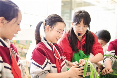 4月17日,大同大学附属小学的同学们在忘忧农场劳动课堂上学习黄花的种植。