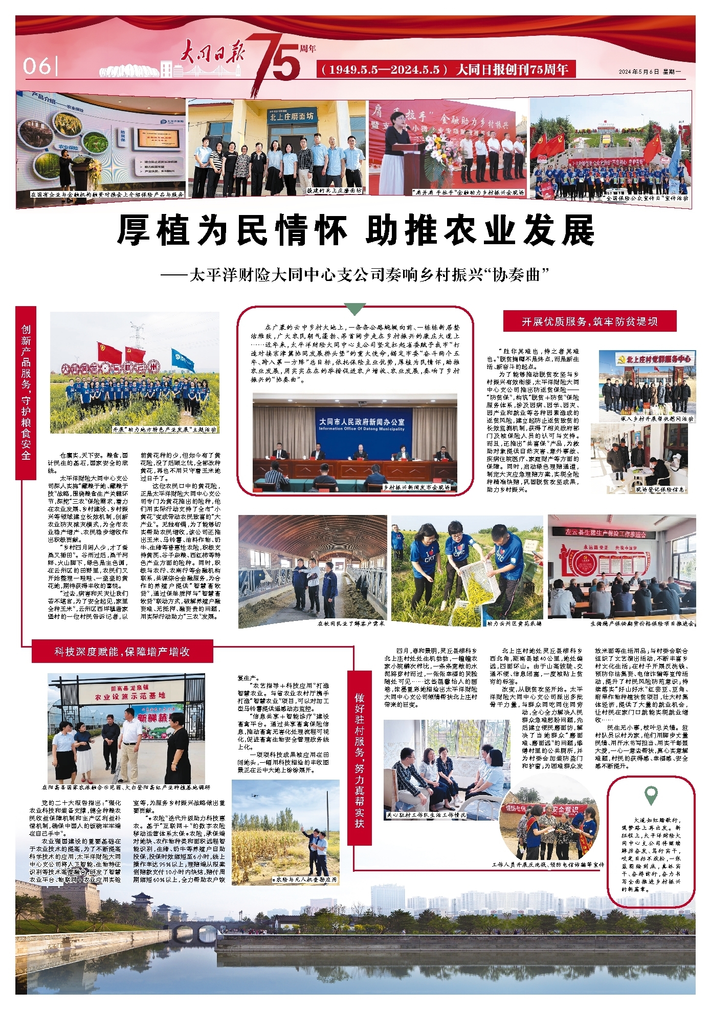太平洋财险大同中心支公司深入实施“藏粮于地、藏粮于技”战略,围绕粮食生产关键环节,深挖“三农”保险需求,着力在农业发展、乡村建设、乡村振兴等领域建立长效机制,创新农业防灾减灾模式,为全市农业稳产增产、农民稳步增收作出积极贡献。