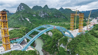 拉密河特大桥钢管拱肋合龙现场(5月10日摄,无人机照片)。