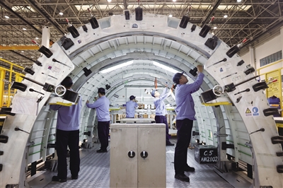 在航空工业沈飞民机车间,工作人员进行机身半壳铆接作业(4月25日摄)。沈阳目前已建立起涵盖航空发动机整机、民用飞机大部件转包和零部件制造、通航及无人机整机以及航空运营和维修服务于一体的全产业链航空体系。未来,沈阳还将依托现有产业基础,加快培育壮大低空经济产业集群,培育发展低空经济,展现辽宁新质生产力发展新活力。 新华社记者 杨青摄