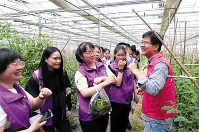 5月19日,交大农学院的科研人员(右)在番茄选育种植大棚内为同学们讲解基因筛选的过程。
