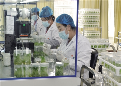 位于左云县三屯乡北十里村的山西蓬勃农业科技股份有限公司,依托山西农业大学科研力量从事脱毒马铃薯种薯繁育和新品种植推广工作,目前,已具备马铃薯茎尖剥离、脱毒种薯组织培养、原原种生产、原种生产、一级种生产的生产体系。近年来,该公司推广带动周边1500余农户制种晋薯16号、冀张薯12号、青薯9号等十几个马铃薯新品种,累计推广种植面积30余万亩。图为工作人员正在进行马铃薯脱毒苗扩繁作业。 本报记者 戎禹仁摄