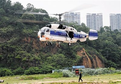 此次演练按照“全流程、全要素、全实战”的要求,开展横向破拆深井救援、支撑破拆救援、高空缆车救援等多项科目,共同促进区域救援能力整体提升。图为,直升机进行物资投放演练。 新华社记者 邓华摄