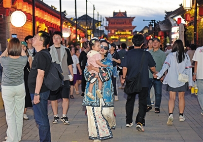 端午假期,夜幕降临的大同古城分外红火热闹,中外游客穿梭在古城的街巷,赏非遗、品文化,感受古城的独特魅力。图为游客在鼓楼东街游览。本报记者 于宏摄
