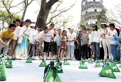 6月9日,在江苏苏州虎丘山景区,小朋友在体验“套粽子”游戏。