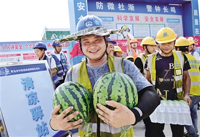 6月12日,在中铁建工青岛市中医医院城阳院区建设工地,建筑工人在领取防暑降温物品。