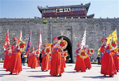近年来,河北省秦皇岛市山海关区依托丰富的历史文化资源,打造历史实景演出、灯光秀等特色节目,积极推进文化和旅游深度融合发展,让游客沉浸式体验“天下第一关”旅游文化,助力区域经济发展。图为,6月12日在河北省秦皇岛市山海关区天下第一关景区拍摄的实景演出《迎宾大典》。 新华社发(李铎摄)