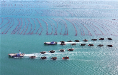 6月17日,在山东省荣成市爱伦湾海带养殖区,养殖工人驾驶满载海带的渔船、舢板返港卸船(无人机照片)。