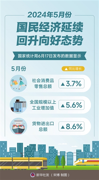 宏观政策效应持续释放。5月份,全国规模以上工业增加值同比增长5.6%,九成地区和八成行业实现增长。服务业生产指数同比增长4.8%,比上个月加快1.3个百分点。