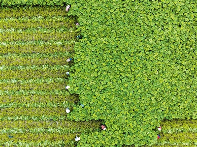 眼下正是“三夏”农忙时节,各地农民抢抓农时,开展夏收、夏种、夏管等农事活动,田间地头呈现一派繁忙景象。图为,6月17日,浙江省湖州市吴兴区埭溪镇上强村村民在收割蜂斗菜(无人机照片)。 新华社发 何伟卫摄
