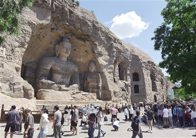 进入6月,我市旅游热度持续上升,各大景区景点游人如织、热闹非凡。图为6月16日,云冈石窟景区内游客络绎不绝。 本报记者 戎禹仁摄