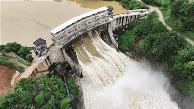 6月18日,位于贵州省黔东南苗族侗族自治州锦屏县境内的八河水电站开闸泄洪(无人机照片)。