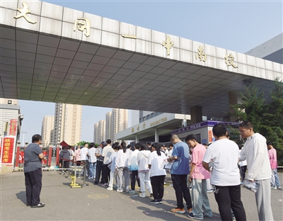 昨日早上7时多,大同五中考点外,已有不少家长和考生在此等候。考生们三三两两聚在一起,利用这最后的一点时间复习语文知识点。警戒线外,家长们目送着孩子们走向考场,“全力以赴,不留遗憾。”“放轻松,正常发挥就是成功。”家长们一声声叮咛着,心中充满了期盼与祝福。“我的目标就是考上重点高中,这样离自己的大学梦就更近一步。”考生赵宸阳脸上洋溢着笑容,轻松步入考场。