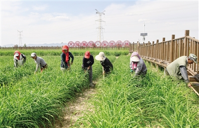 6月18日,云州区唐家堡黄花种植基地内,农民正在对黄花地进行除草管护。