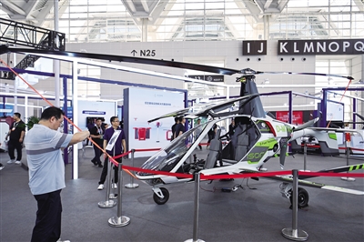6月20日,参观者在博览会低空经济展团现场参观一款自旋翼机。