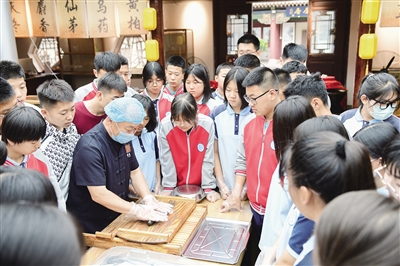 中华老字号广盛原的源头可追溯至明万历八年(1580年),传承至今已有四百多年历史。为更好传承弘扬中医药文化,2020年,广盛原在大同古城鼓楼东街按原老号风格建设广盛原中医药文化博览苑,并于2023年经山西省文物局备案更名为广盛原中医药文化博物馆。博物馆免费对外开放,并积极开展研学活动,宣传普及中医药文化,与全国中小学生研学实践教育大同营地合作,成为其直属第三批大同研学基地,开展《身边的中药》《传统大蜜丸加工技艺》等课程及博物馆参观,对中小学生认识中医药、学习传统文化等起到了重要作用,目前,已累计接待研学学生5000余人次。图为6月26日,百余名实验中学学生在该博物馆体验大蜜丸的制作。 本报记者 张占兵摄