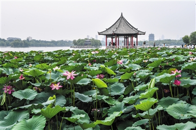 近日,山东省济南市大明湖荷花盛开,再现“四面荷花三面柳”的美景,吸引游客前来观赏。新华社记者 朱峥摄