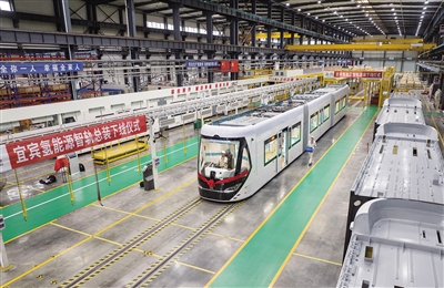 7月1日,在位于四川省宜宾的中车铁投轨道交通产业基地生产车间,氢能源智轨电车总装下线。该氢能源智轨电车由我国自主研制,将于今年8月在宜宾智轨T4线投入使用。