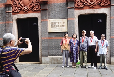 7月1日,几名老党员相约来到一大会址前,佩戴着“光荣在党50年”纪念章,合影留念。