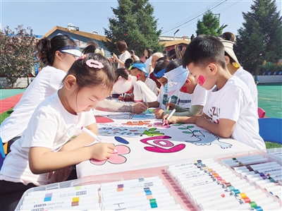 日前,新荣区机关幼儿园开展“童心向党 喜迎七一”画卷涂色爱国主义教育主题活动。孩子们在家长的陪伴下,用稚嫩的小手在长达10米的画卷上描绘出对党和祖国的热爱与赞美。 本报记者 于宏摄