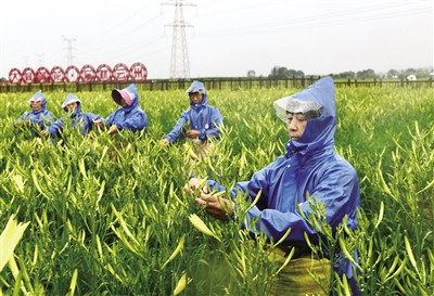 7月12日,在云州区唐家堡村黄花标准化种植基地,黄花采摘正在火热进行。 本报记者 张燕伟摄