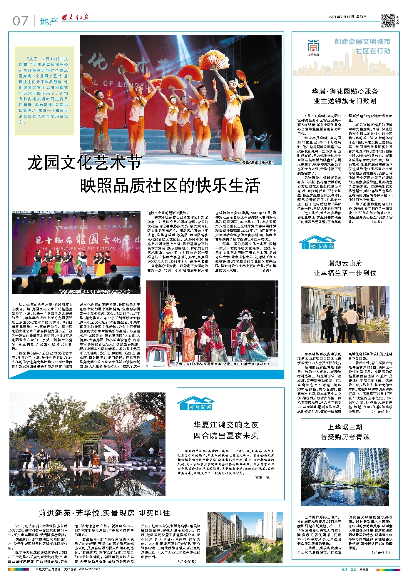 “定了!7月18日正式启幕!”当翔龙集团物业公司总经理李芳将这个消息通知到5个龙园小区时,龙园业主们无不欢欣鼓舞,他们盼望的第十五届龙园文化艺术节终于来了。而翔龙物业则抓紧时间进行节目精选、舞台搭建、表演排档等等,力求将一个精彩而高品位的艺术节呈现给业主。