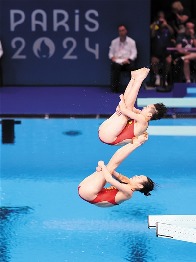 当日,在巴黎奥运会跳水女子双人3米板决赛中,中国选手昌雅妮/陈艺文夺得金牌。 新华社记者 李明摄