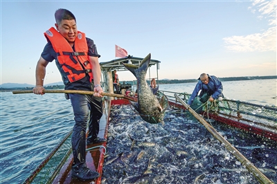 连日来,在河南省洛阳市嵩县陆浑湖,渔业工人冒着酷暑进行捕捞,湖面一派鱼跃人欢的丰收景象。 新华社发(李卫超摄)