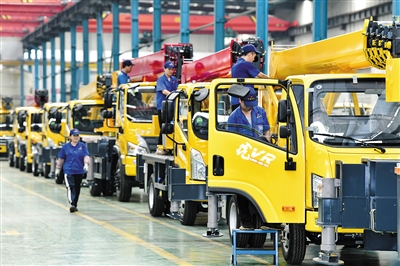 8月4日,在济宁四通工程机械有限公司总装车间,工作人员在吊车生产线上工作。