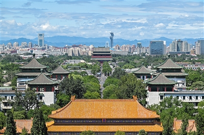 从景山上延北京中轴线向北眺望鼓楼(8月12日摄)。