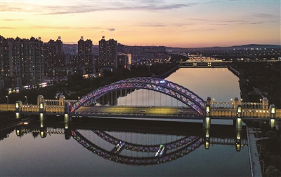 古城外则是另一番景象,到处是高楼广厦、万家灯火。向东望去,润泽古都大同的母亲河御河在夜色下平静而灵动,“一轴双城”的构想通过北环桥、平城桥、兴云桥、北都桥、迎宾桥、南环桥和开源桥7座大桥得以连接,这7座大桥各具独特气质,桥上星星点点车流不息,配合着或简洁、或大气、或缤纷、或优雅的霓虹灯光,造就了御河之上的最美夜景。御河两岸连片灯火通明的楼宇,以及酒店、写字楼等楼体外的大型户外灯光秀,整齐倒映在平静的河面上,使得沉静的夜色如梦似幻,尽显城市繁华。