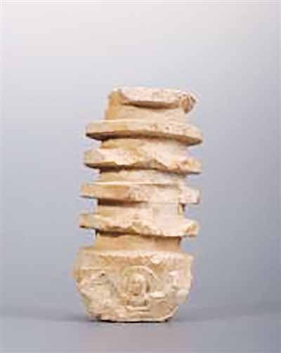塔刹残件,通高12.5厘米、底座高3.6厘米、宽与厚均为6.4厘米。上部为圆柱体,下部为方形体底座,侧面呈倒梯形。圆柱体上雕相轮五层,相轮直径、厚度大致相同,相轮间的距离相等约1.1厘米。上端的一层相轮已经残缺,顶部残存一个方形卯口的凹槽,凹槽中有 一方形榫头构件。下部的阶梯形承花之内雕童子半身像,童子高2.1厘米,光头,面相丰圆,颈戴项圈,双臂饰臂钏,斜披络腋,背后饰圆形头光。