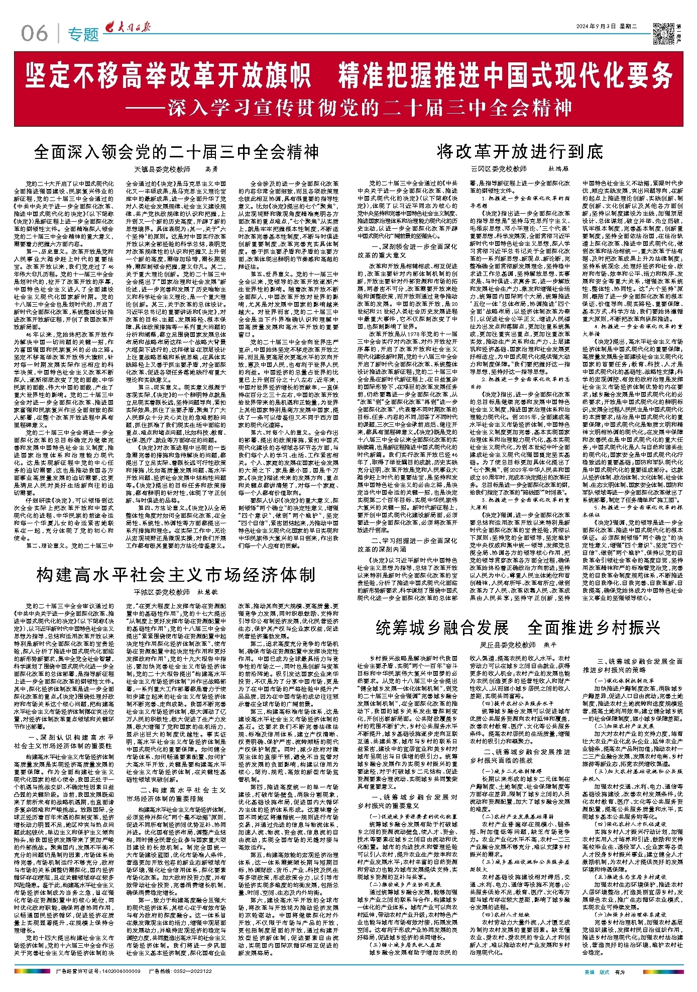 改革开放是从1978年党的十一届三中全会实行对内改革、对外开放拉开序幕的,开启了改革开放和社会主义现代化建设新时期;党的十八届三中全会开启了新时代全面深化改革、系统整体设计推进改革新征程;党的二十届三中全会是在新时代新征程上,在日益复杂的国际形势下,在艰巨的改革发展任务前,仍然要靠进一步全面深化改革,从“改革”到“全面深化改革”再到“进一步全面深化改革”,代表着不同时期改革的目标、任务、内容的不同,回答了不同时代的课题,三次三中全会承前启后、继往开来,都具有里程碑意义。《决定》既是党的十八届三中全会以来全面深化改革的实践续篇,也是新征程推进中国式现代化的时代新篇。我们实行改革开放已经46年了,取得了举世瞩目的成就,历史实践充分证明,改革开放是党和人民事业大踏步赶上时代的重要法宝,是坚持和发展中国特色社会主义的必由之路,是决定当代中国命运的关键一招,也是决定实现第二个百年目标、实现中华民族伟大复兴的关键一招。新时代新征程上,要开创中国式现代化建设新局面,必须要进一步全面深化改革,必须将改革开放进行到底。