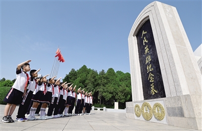9月3日,河北省邯郸市邯山区赵王小学的学生在晋冀鲁豫烈士陵园人民英雄纪念墓前敬礼。