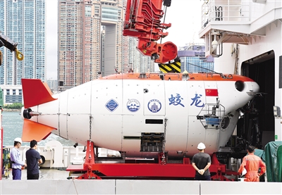 这是停靠于香港尖沙咀海运码头的“深海一号”远洋科考船上的“蛟龙号”(9月24日摄)。