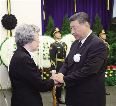 10月14日,吴邦国同志遗体在北京八宝山革命公墓火化。习近平、赵乐际、王沪宁、蔡奇、丁薛祥、李希、韩正等前往八宝山送别,胡锦涛送花圈表示哀悼。这是习近平与吴邦国亲属握手,表示深切慰问。 新华社记者 鞠鹏摄